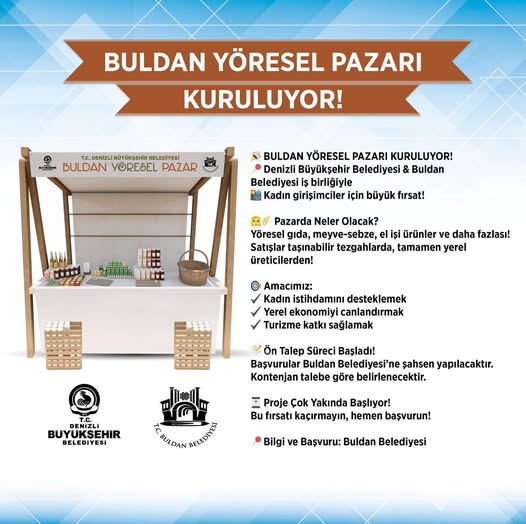 Çalışmalarla ilgili açıklamasın da Belediye başkanı Mehmet Ali Orpak “Buldan Belediyesi ile Denizli Büyükşehir Belediyesi iş birliğinde kurulacak Pazar, kadın girişimciler için büyük bir fırsat hayata dönüşecek. Tamamen yerel üreticilerden oluşacak Buldan Yöresel Pazar’ı için hazırlıklara başladık. Yöresel gıda, meyve-sebze, el işi ürünler ve daha birçok yerel ürünün satışa sunulacağı pazarda, taşınabilir tezgahlar kullanılacak. Proje ile birlikte kadın istihdamını artırmak, yerel ekonomiyi canlandırmak ve ilçemiz turizmine katkı sağlamayı hedefleniyoruz” dedi.